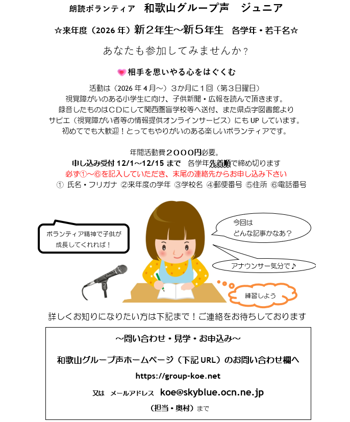 2025年10月15日 / 最終更新日 : 2025年10月15日 グループ声 お知らせ 2026年度 小学生朗読ボランティア募集 見学等はグループ声HP上のお問い合わせ欄から、又はメールにて、事前にお問い合わせください。 活動は、年間通じて毎月一回、第三日曜日ふれ愛センターで実施しています。